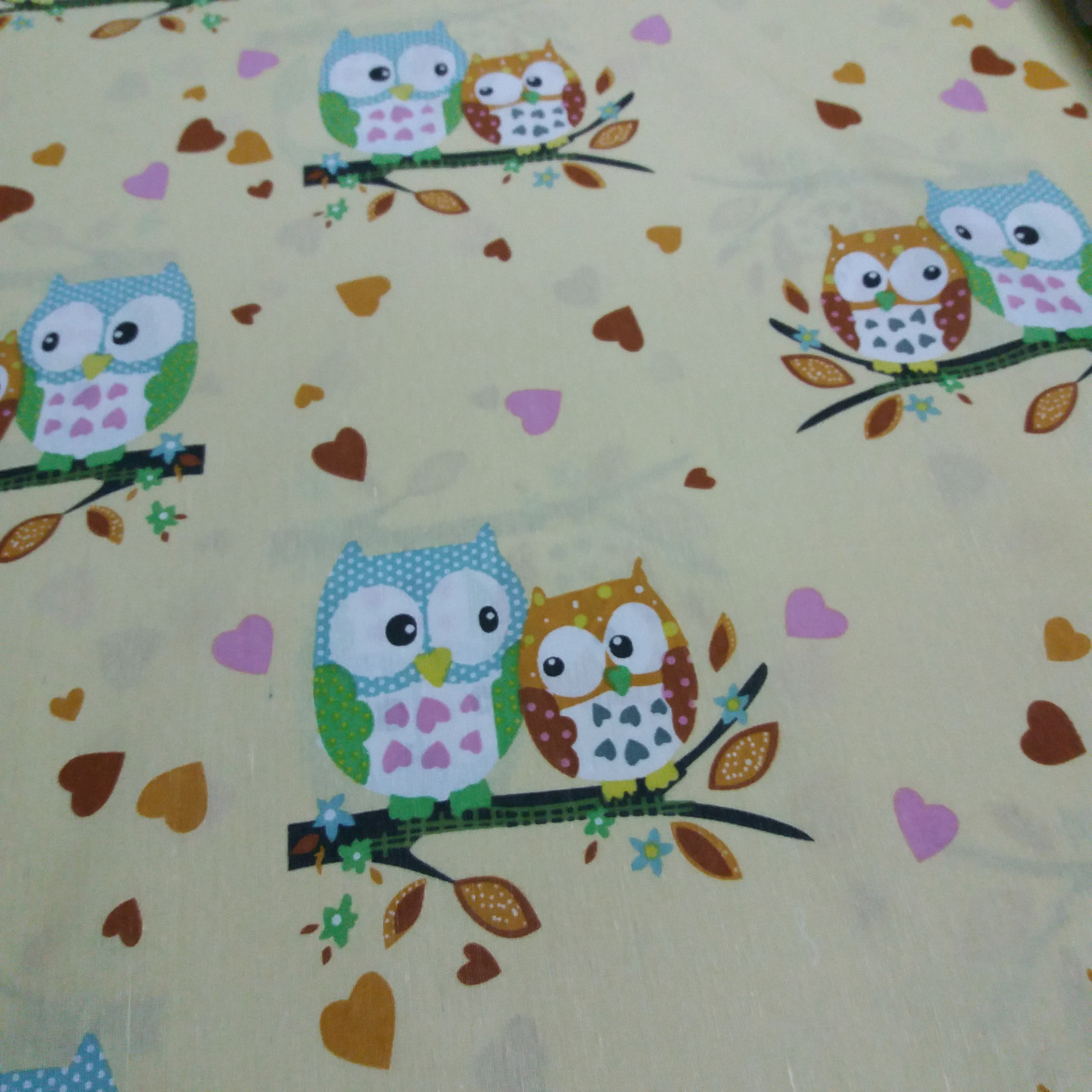 Бязь набивна із совами на гілочці неніжному жовтому тлі завширшки 220 см купити недорого в роздріб в інтернет-магазині тканин "Натуральні тканини" з доставкою по Україні.